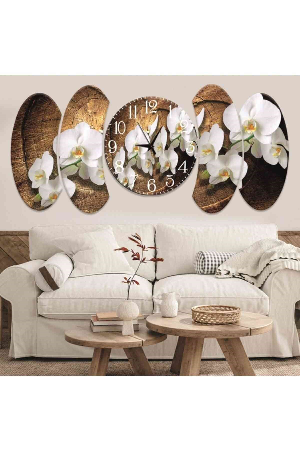 5 Parça Çiçek Tasarım Saatli Mdf Tablo