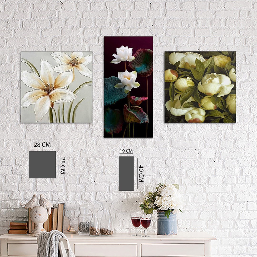 3 Parça Dekoratif Çiçekler Çizim Mdf Tablo - 3Yatay-553 30X40