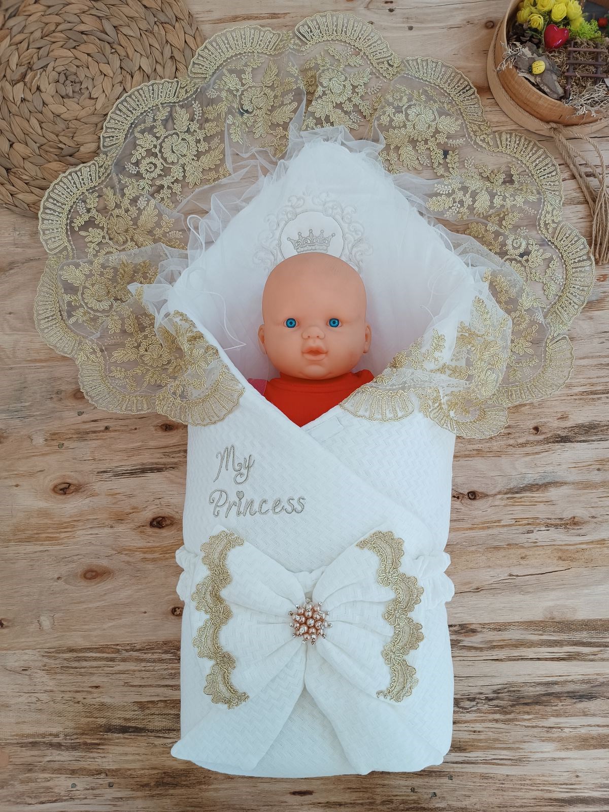 Yenidoğan Pamuk Taç Benim Prensesim Nakışlı Trilüks Kundak Bebek Battaniyesi