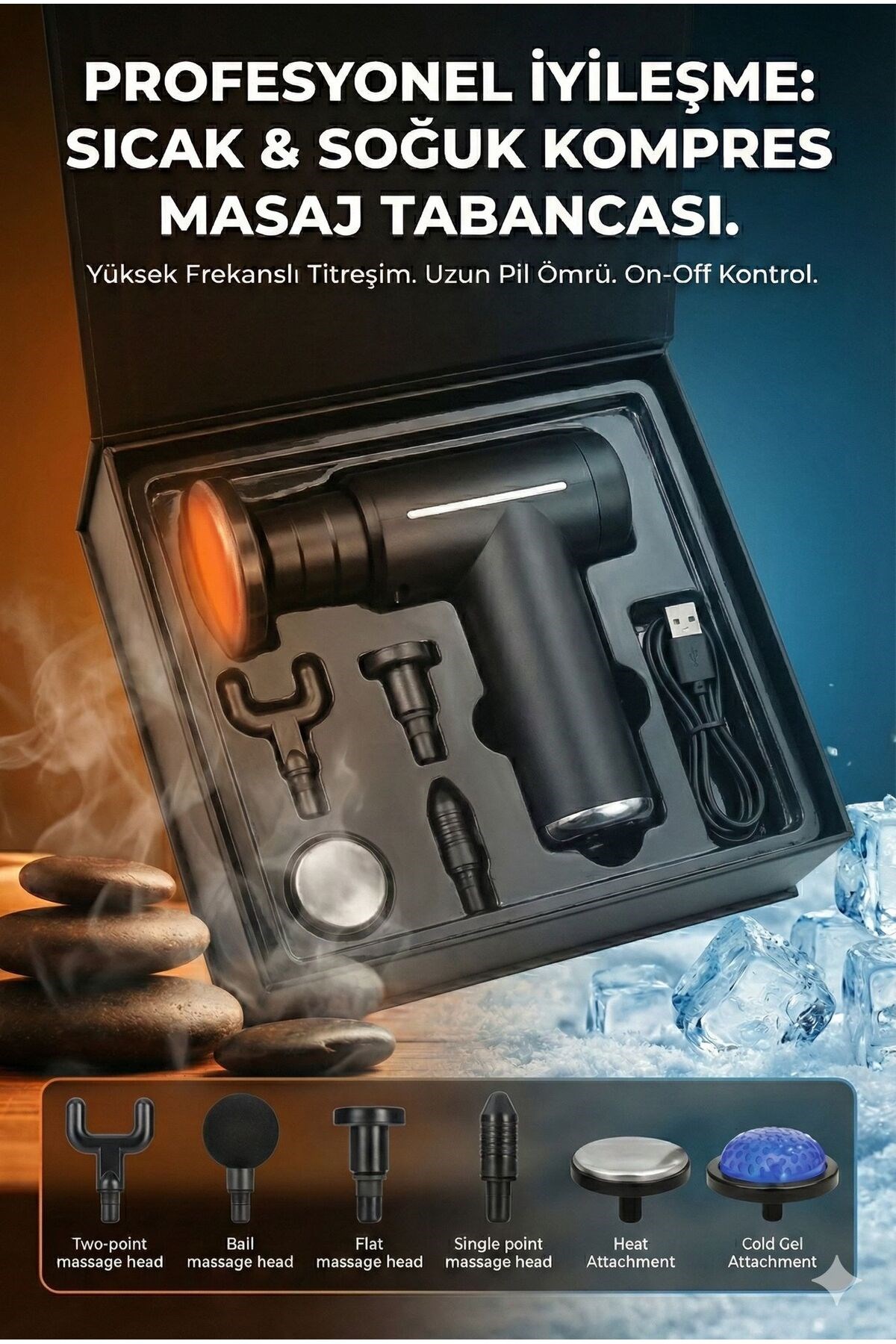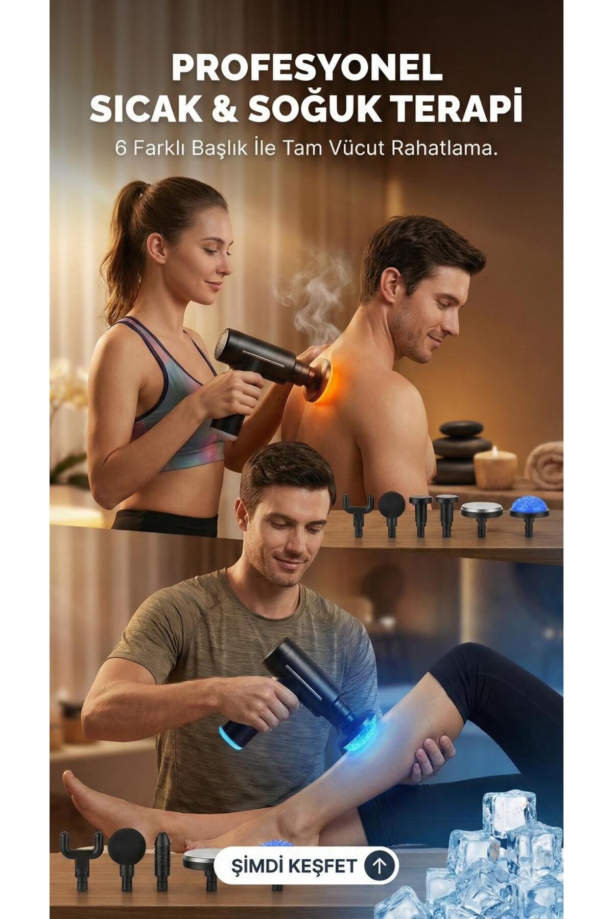 Kas Ağrılarına ve Yorgunluğa Son Verin! Gün boyu masa başında mı çalışıyorsunuz yoksa ağır antrenmanlar mı yapıyorsunuz? İhtiyacınız olan tam profesyonel bakım bu kutunun içinde.; Hem ısıtarak gevşeten hem de soğuk etkisiyle ağrıyı dindiren bu set ile yaşam kalitenizi artırın.; Neden Bu Ürünü Seçmelisiniz? * Çift Etkili Terapi: Sadece titreşim değil, termal etki ile masaj deneyimini ikiye katlar.; * Derin Doku Masajı: Yüksek frekanslı vuruşları ile kasın en derinine inerek gerginliği alır.; * Kişiselleştirilebilir Hız: Hassas bölgelerden sert kas gruplarına kadar ayarlanabilir hız seviyeleri.; * Ergonomik Tasarım: Tek elle kolay kullanım sağlayan, kaymaz ve terletmez tutuş yüzeyi.; * Taşınabilir Güç: Uzun pil ömrü ve Type-C şarj kolaylığı ile spor salonuna veya seyahate götürün.; Başlıkların Kullanım Alanları: 1. Top Başlık: Büyük kas grupları (Kol, bel, kalça, bacak).; 2. U (Çatal) Başlık: Boyun, omurga ve aşil tendonu çevresi.; 3. Mermi (Tek Nokta) Başlık: Tetik noktalar, avuç içi ve ayak tabanı.; 4. Düz Başlık: Tüm vücut gevşemesi.; 5. Isıtma & Soğutma Başlıkları: Özel termal terapi seansları için.; Teknik Detaylar: * Şarj Tipi: USB Type-C * Renk: Mat Siyah * Kontrol: Dijital Dokunmatik / Tek Tuş
