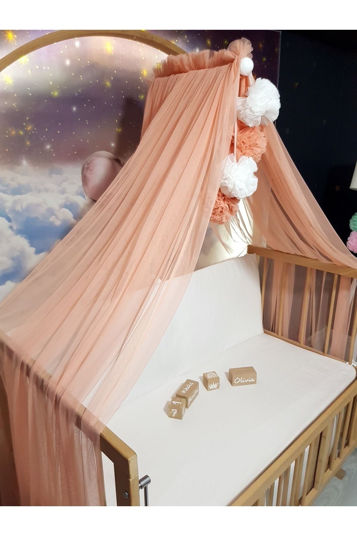 Bebek Lüks Cibinlik Takımı - Dört Ponponlu Somon Likra Tül (Cibinlik Aparatı Dahil)