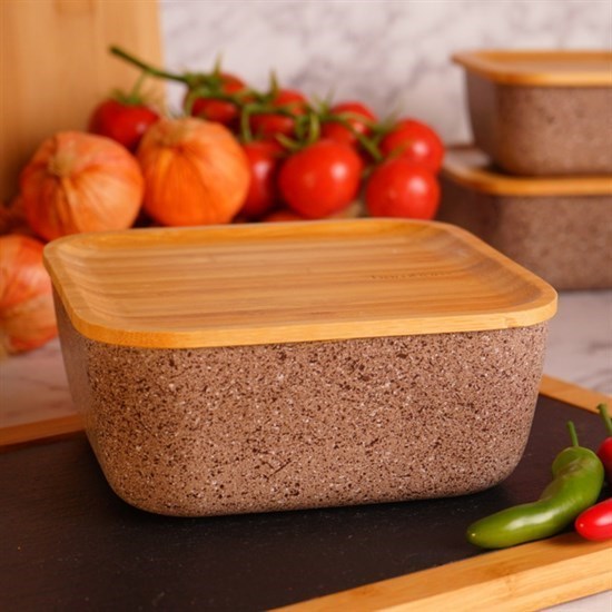 Slalom Kare - Bambu Kapaklı Granit Saklama Kabı 12,5Cm Bej-24479