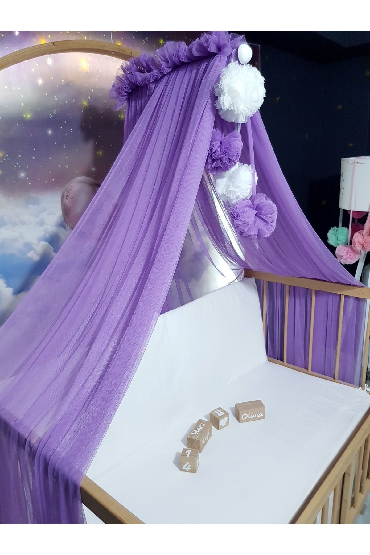 Bebek Lüks Cibinlik Takımı - Dört Ponponlu Lila Likra Tül (Cibinlik Aparatı Dahil)