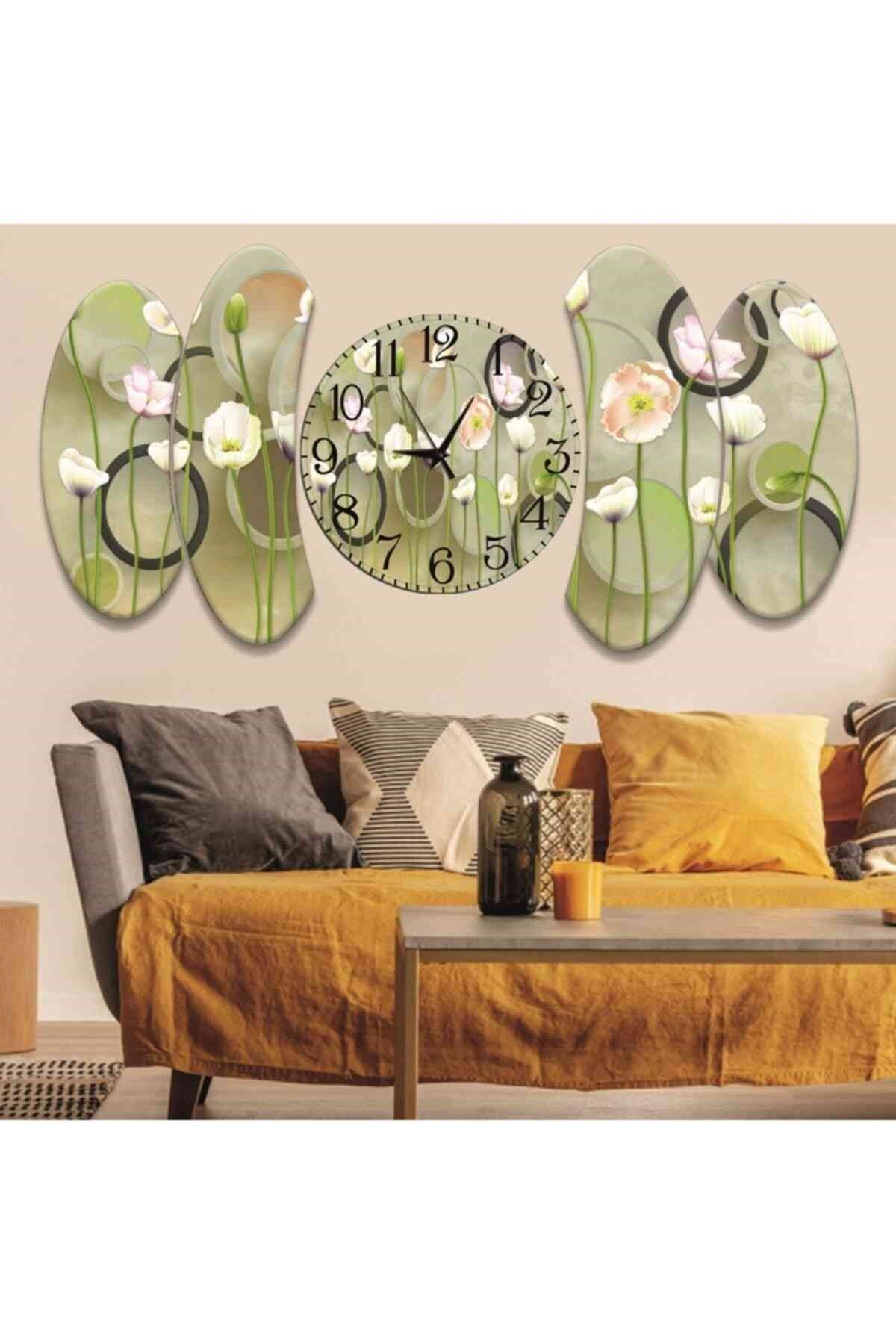 5 Parça Illüstrasyon Çiçek Tasarım Saatli Mdf Tablo