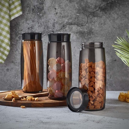 110x110x262 Zarif ve sade bir tasarıma sahip olan siyah visible cam kavanoz kuru gıda, atıştırmalık, turşu, salça, un, hamur işi saklamak için idealdir.Bulaşık makinesinde yıkanmaya uygundur.Gövde cam olduğu için dondurucuda kullanılmaması önerilir.