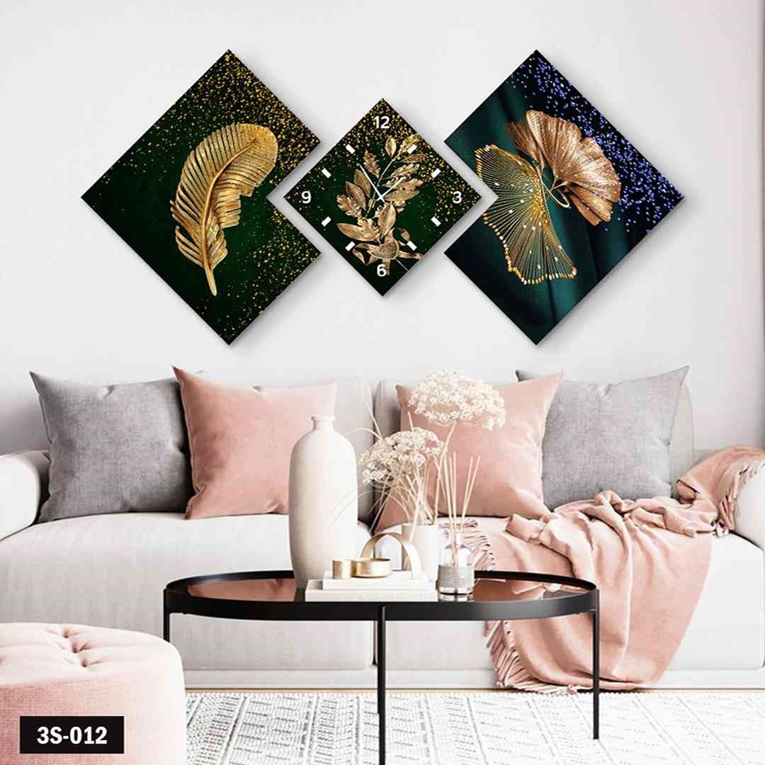 3 Parça Saatli Mdf Tablo Gold Yapraklar - 3S-012 160X60