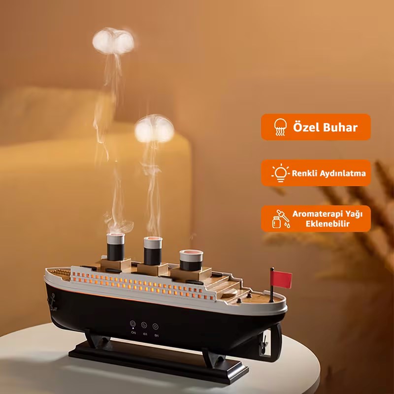 Titanic Aromaterapi Hava Nemlendirici, benzersiz gemi tasarımı ile hem şık bir dekoratif ürün hem de etkili bir hava nemlendiricidir. Bu difüzör, evinizde veya ofisinizde kuru hava problemini azaltarak daha sağlıklı bir ortam yaratmanıza yardımcı olur.