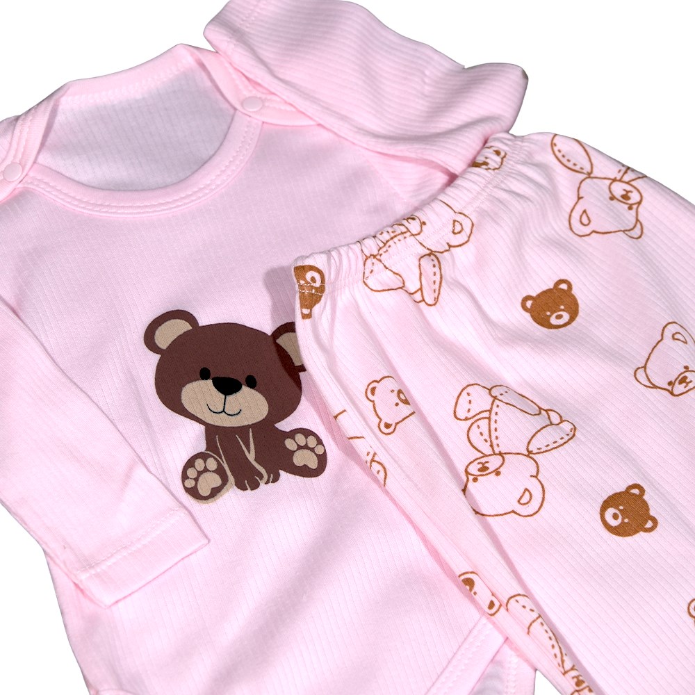 Pembe renkli, ayıcık baskılı bu bebek zıbın takımı %100 organik pamuktan üretilmiştir. Nefes alabilen yapısı sayesinde terletmez, yumuşacık dokusuyla bebeğinizin hassas cildiyle tam uyum sağlar. Üst kısmında sevimli bir ayıcık deseni, alt kısmında ise çeşitli ayıcık ve oyuncak desenleriyle görsel olarak da dikkat çeker. Günlük kullanım için idealdir ve kolayca giydirilip çıkarılabilir. Hem sağlıklı hem de şık bir tercih arayan ebeveynler için mükemmel bir üründür.