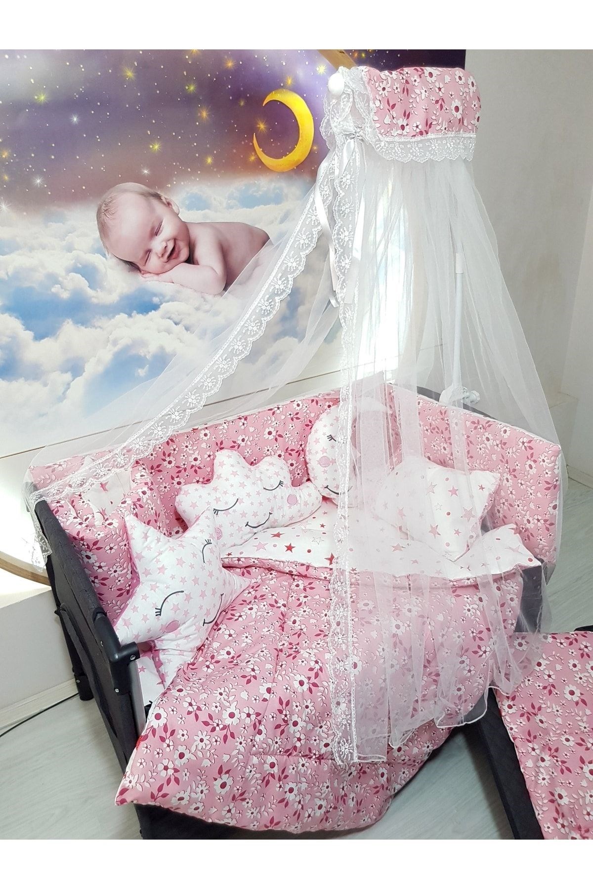 Cibinlikli 12 Parça Bebek Uyku Seti - 70x110 Park Beşiklere - Pembe Çiçek Yıldız Serisi (Cibinlik Aparatı Dahil , Beşik Hariç)