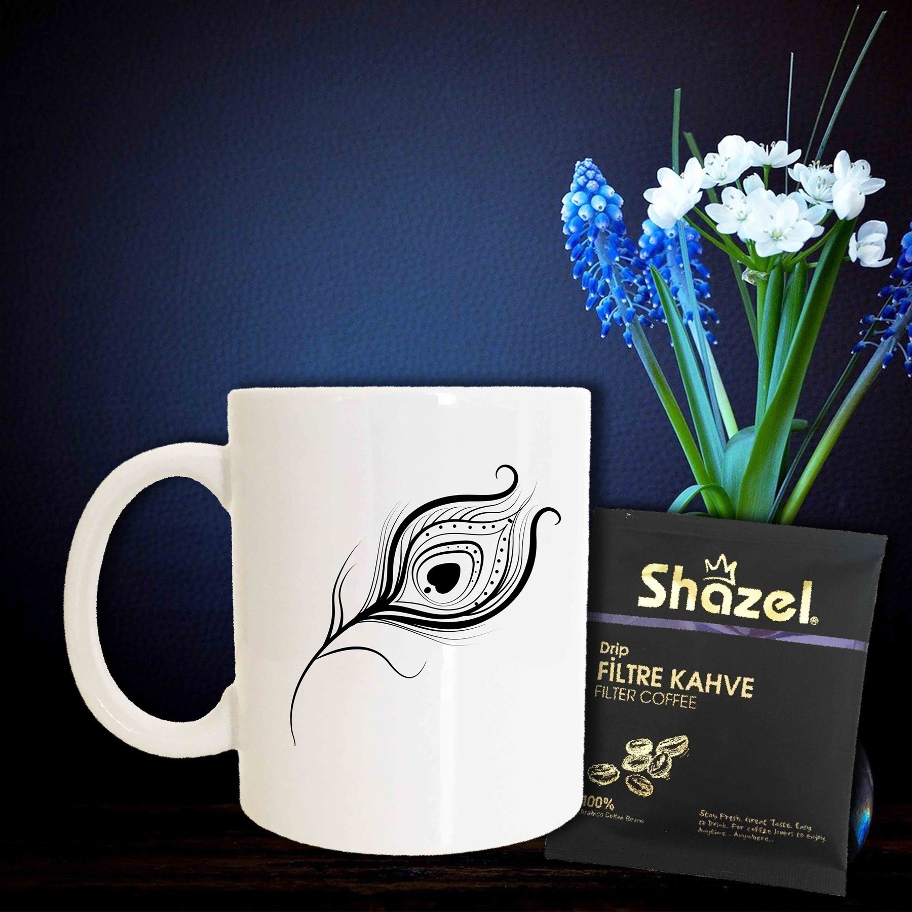 Tavuskuşu Tüyü Desenli Porselen Kupa Bardak